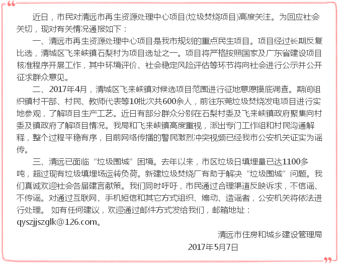 關(guān)于清城區(qū)飛來峽鎮(zhèn)石梨村清遠(yuǎn)市再生資源處理中心項(xiàng)目的情況通報(bào)